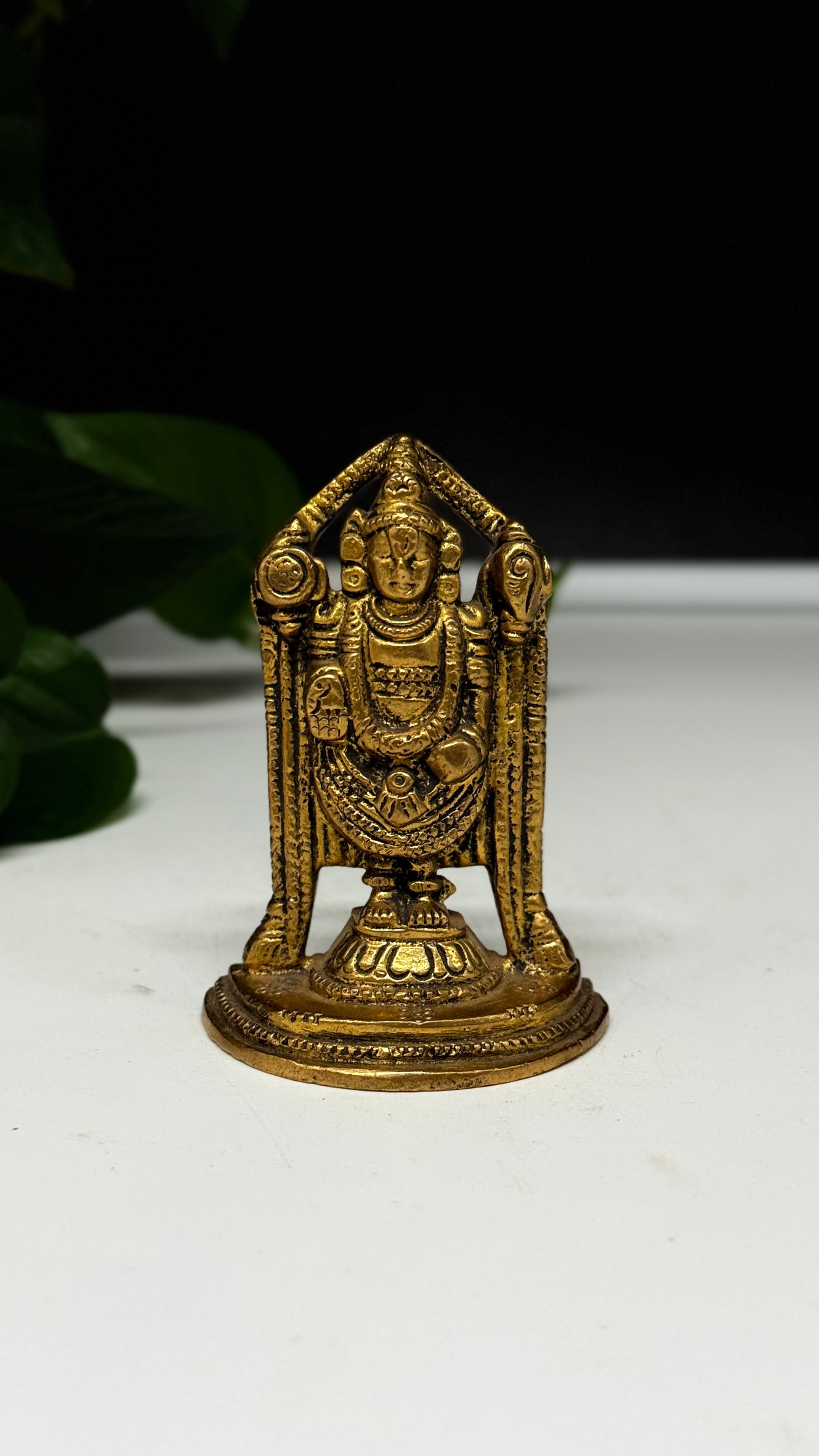 Expertly crafted from premium solid brass, it showcases intricate detailing from Balaji’s traditional alankaram to the ornate brass arch that frames him gracefully. The antique finish adds a classic, timeless aura, making it suitable for both modern and traditional homes.