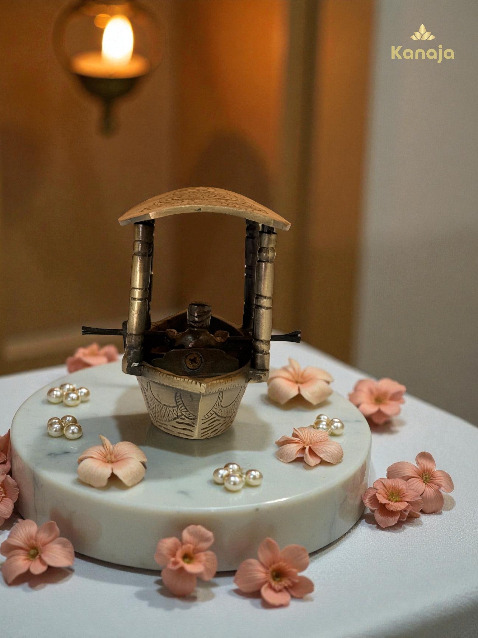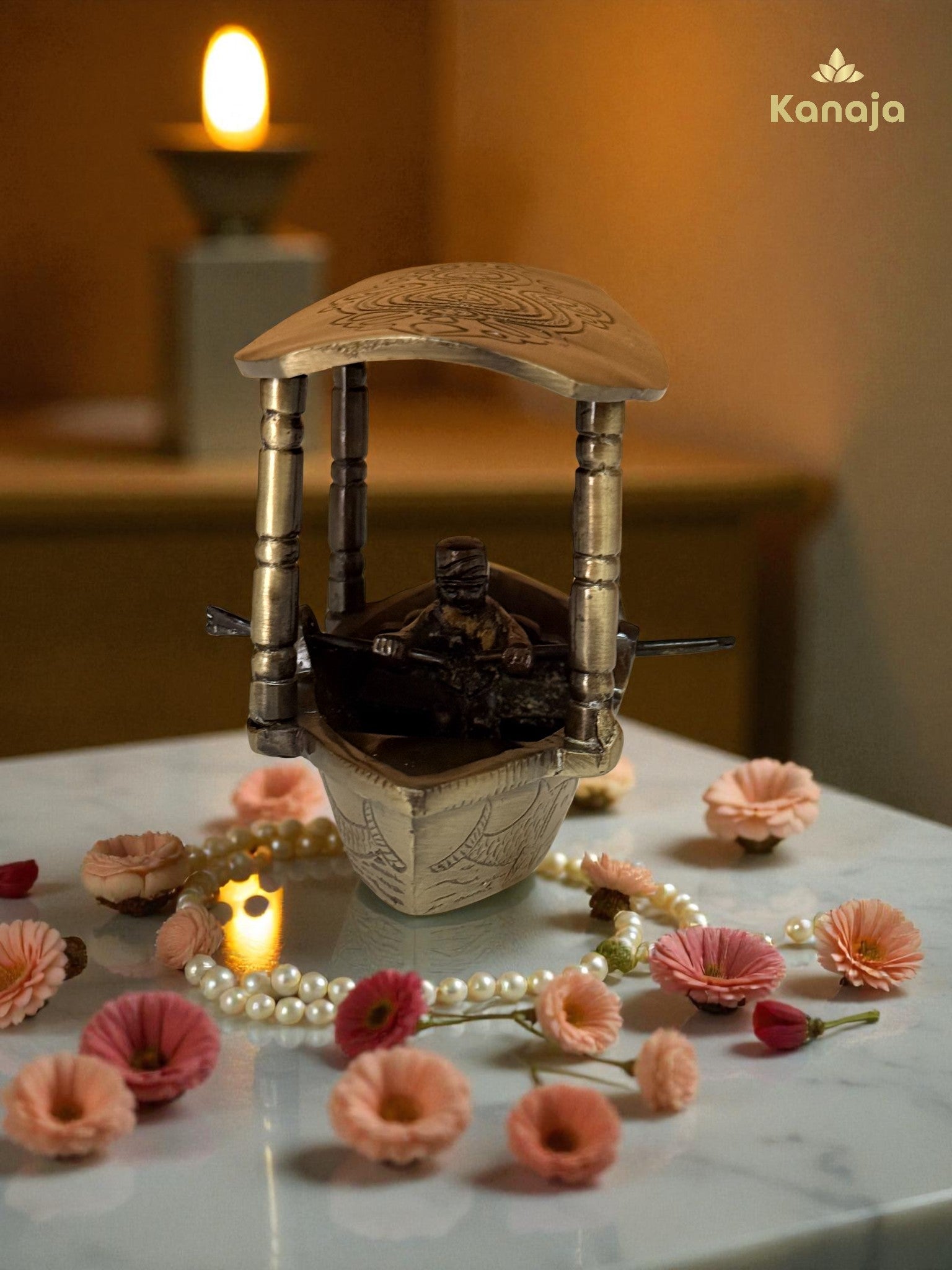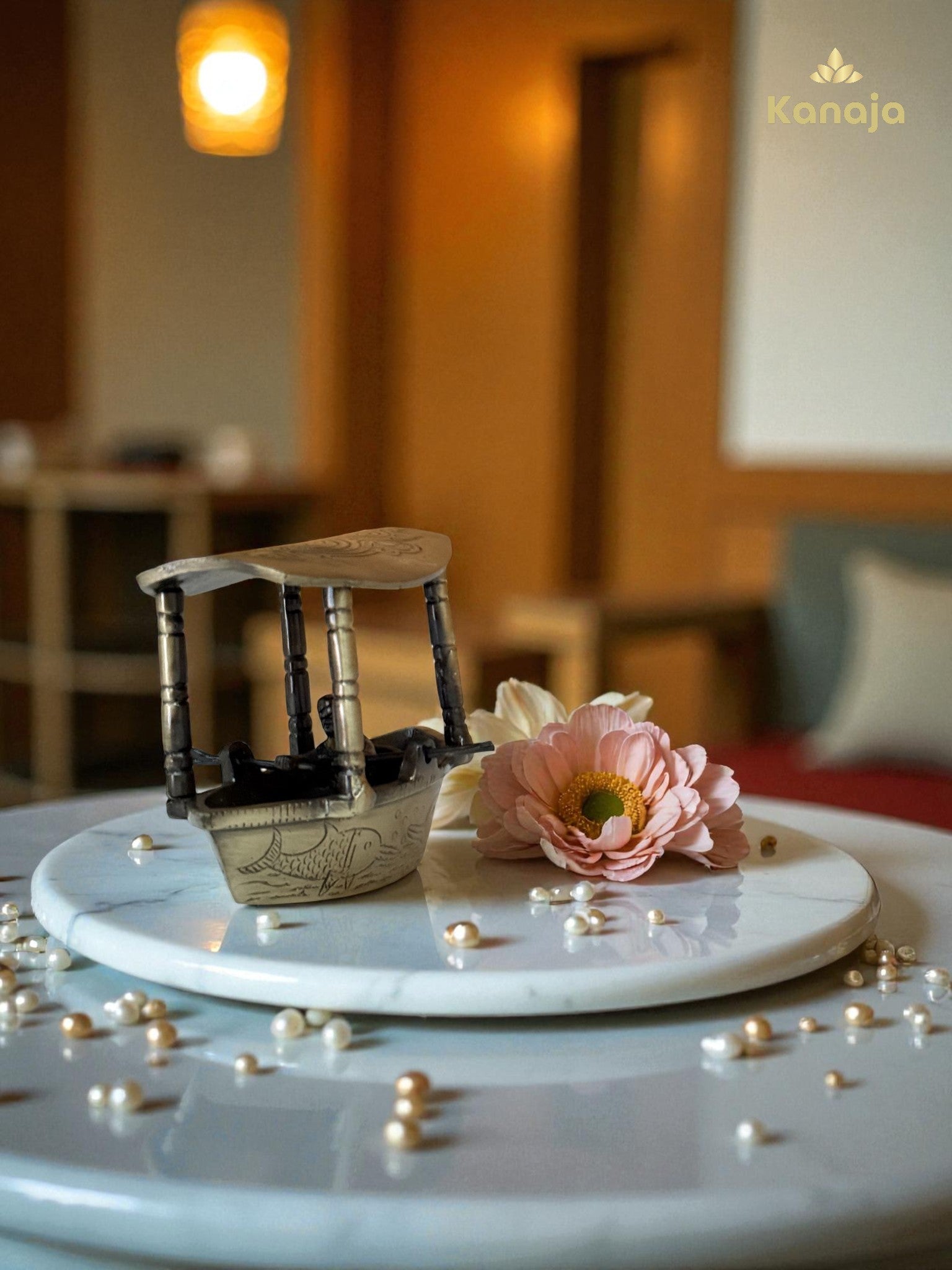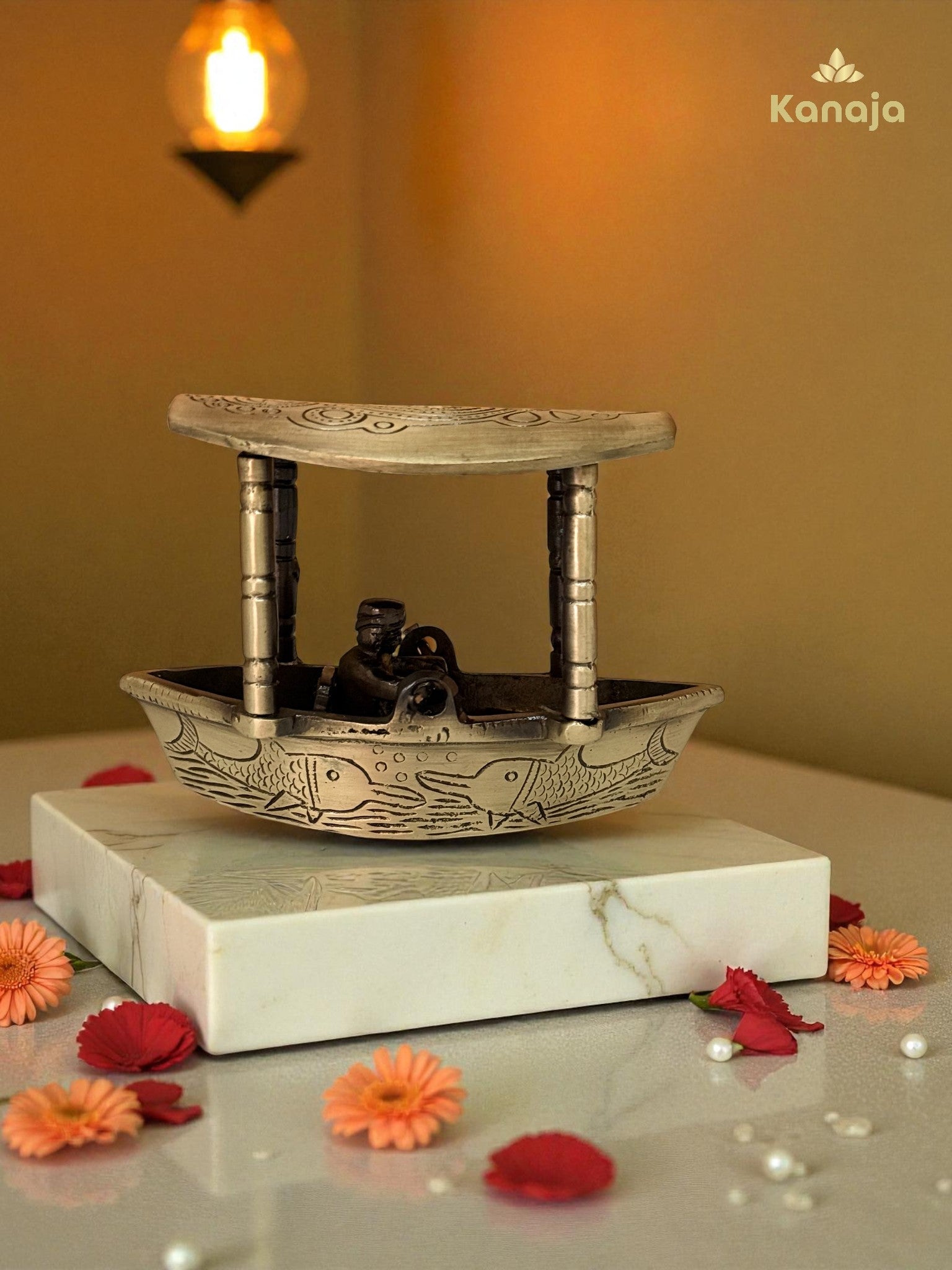 Sail into tranquility with this Artisanal Golden Fishing Boat with Fisherman Figurine, a beautifully handcrafted piece that captures the calm and rhythm of life on the water. This exquisite miniature showcases a traditional fishing boat with a seated fisherman under a delicate canopy — a perfect reflection of peaceful, everyday artistry.