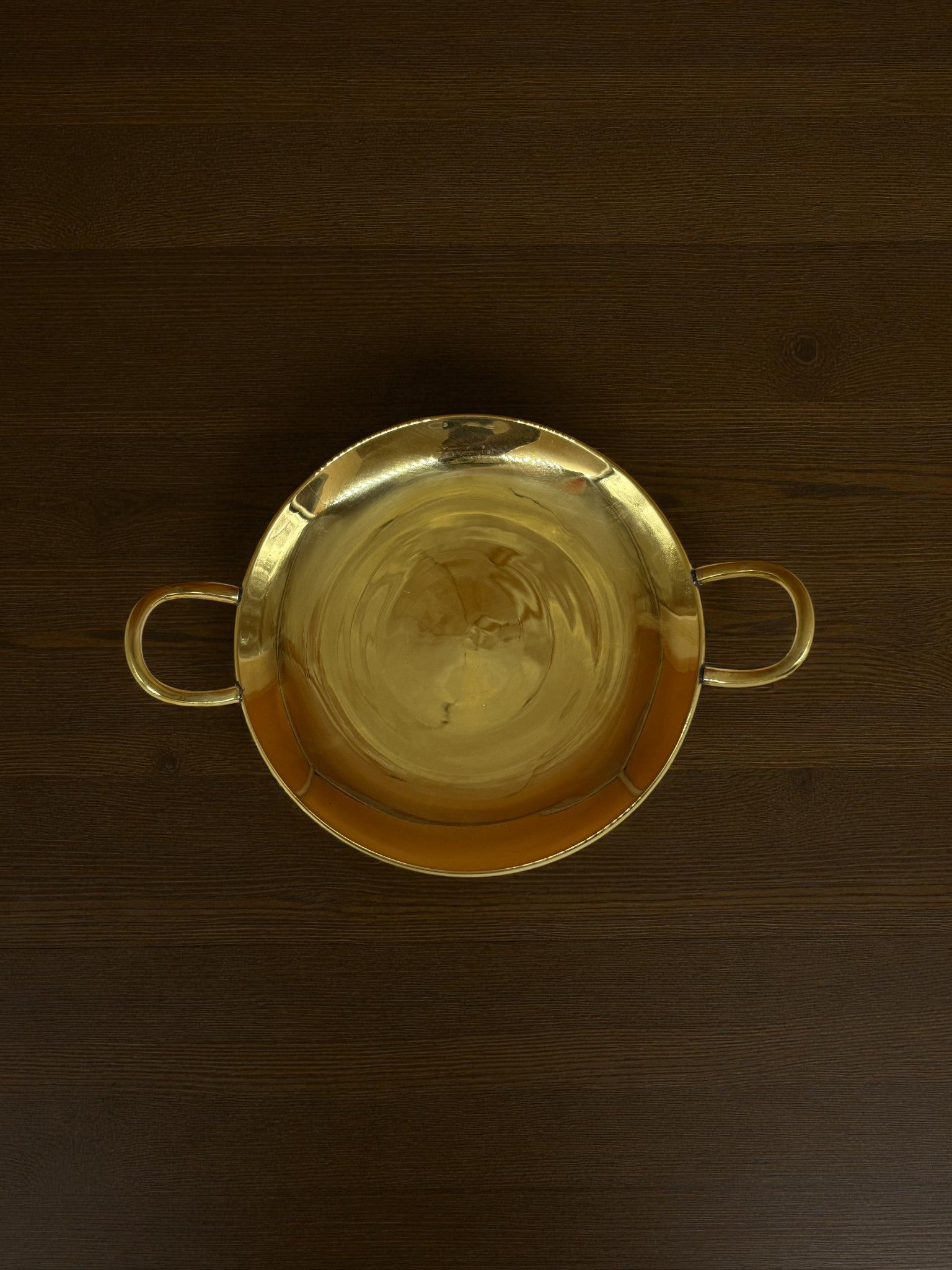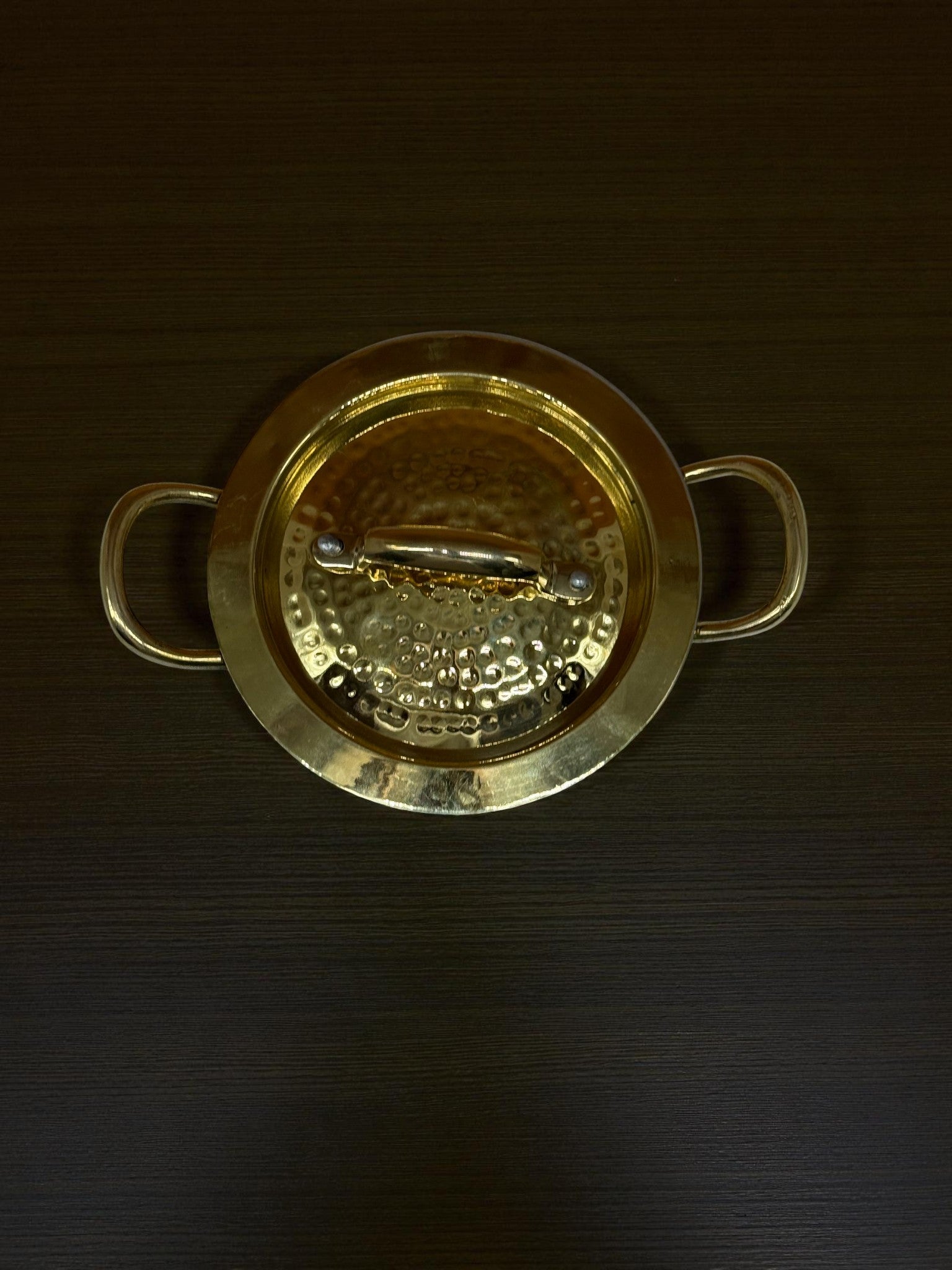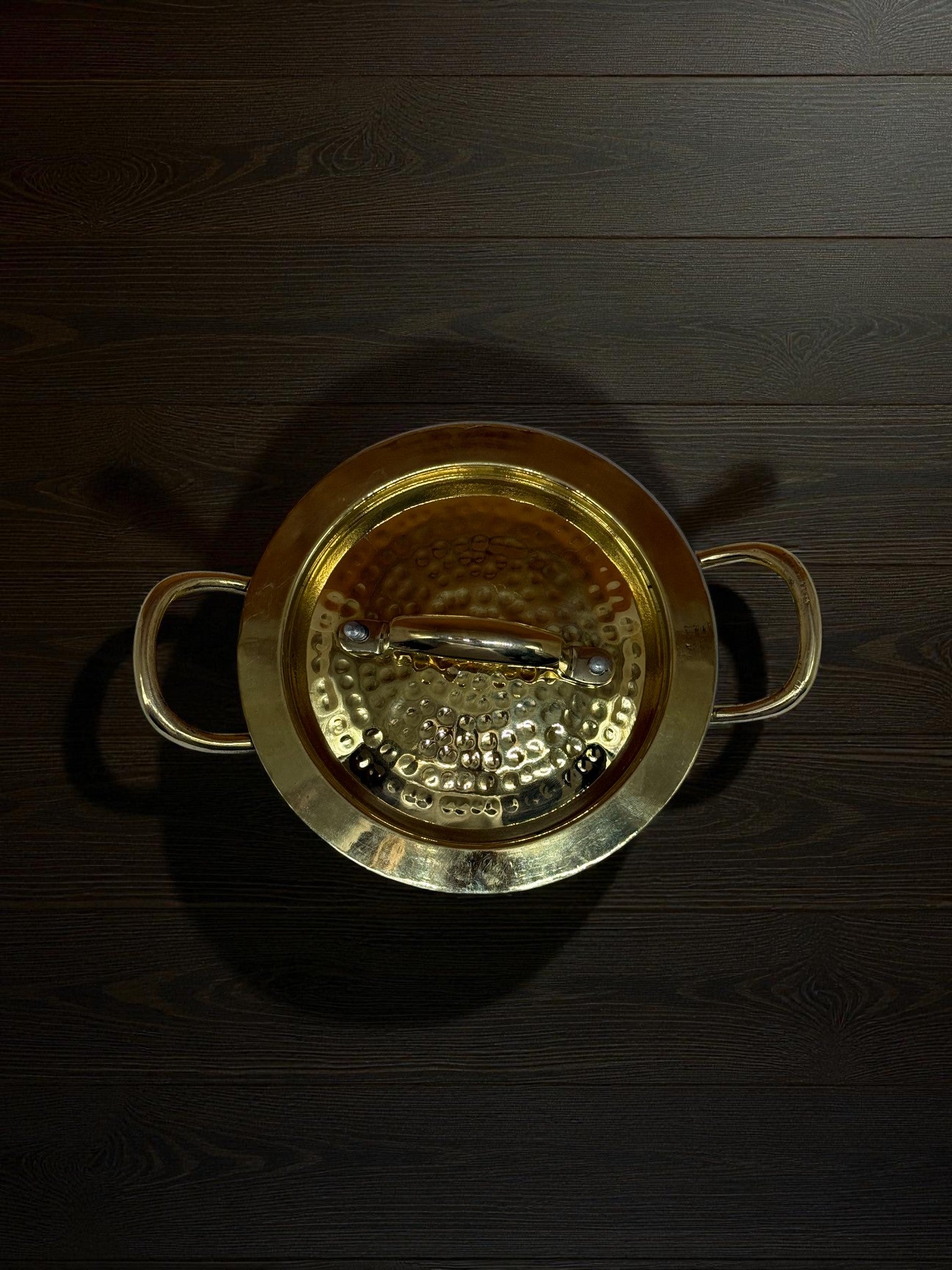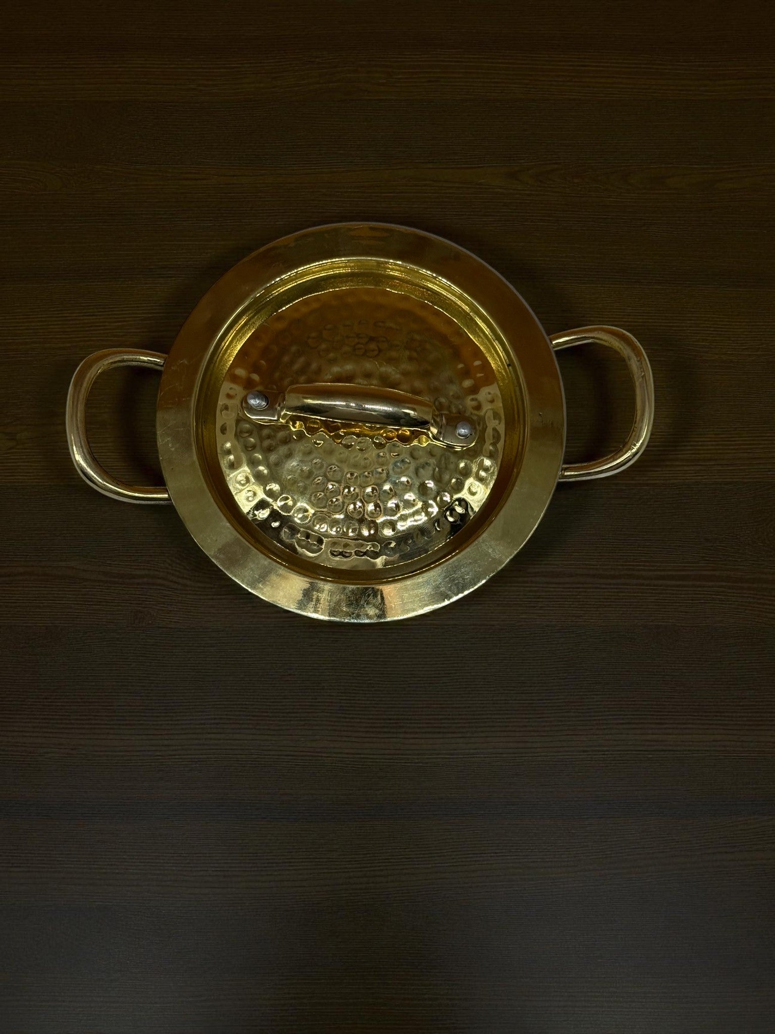 Crafted from premium-quality brass, the vessel features a refined hammered lid paired with a smooth, radiant body that showcases timeless craftsmanship. The warm golden finish brings a classic charm, while the sturdy side handles ensure easy lifting and safe handling. The perfectly fitted lid helps retain heat, making it ideal for serving hot dishes.