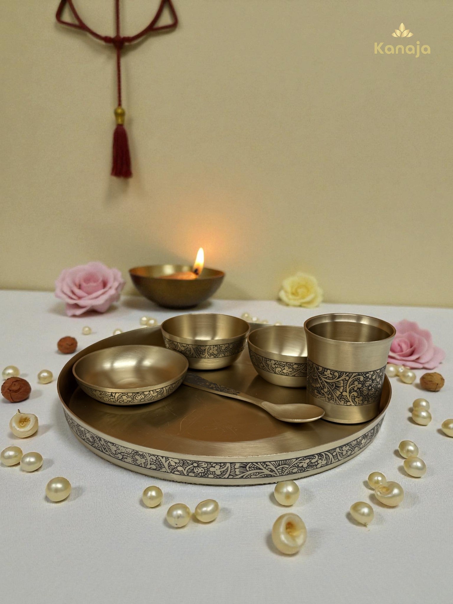 The warm antique finish adds a luxurious glow, making this set perfect for daily meals, festive celebrations, and pooja rituals. Each piece carries cultural richness and timeless craftsmanship, making it a functional as well as decorative addition to any home.