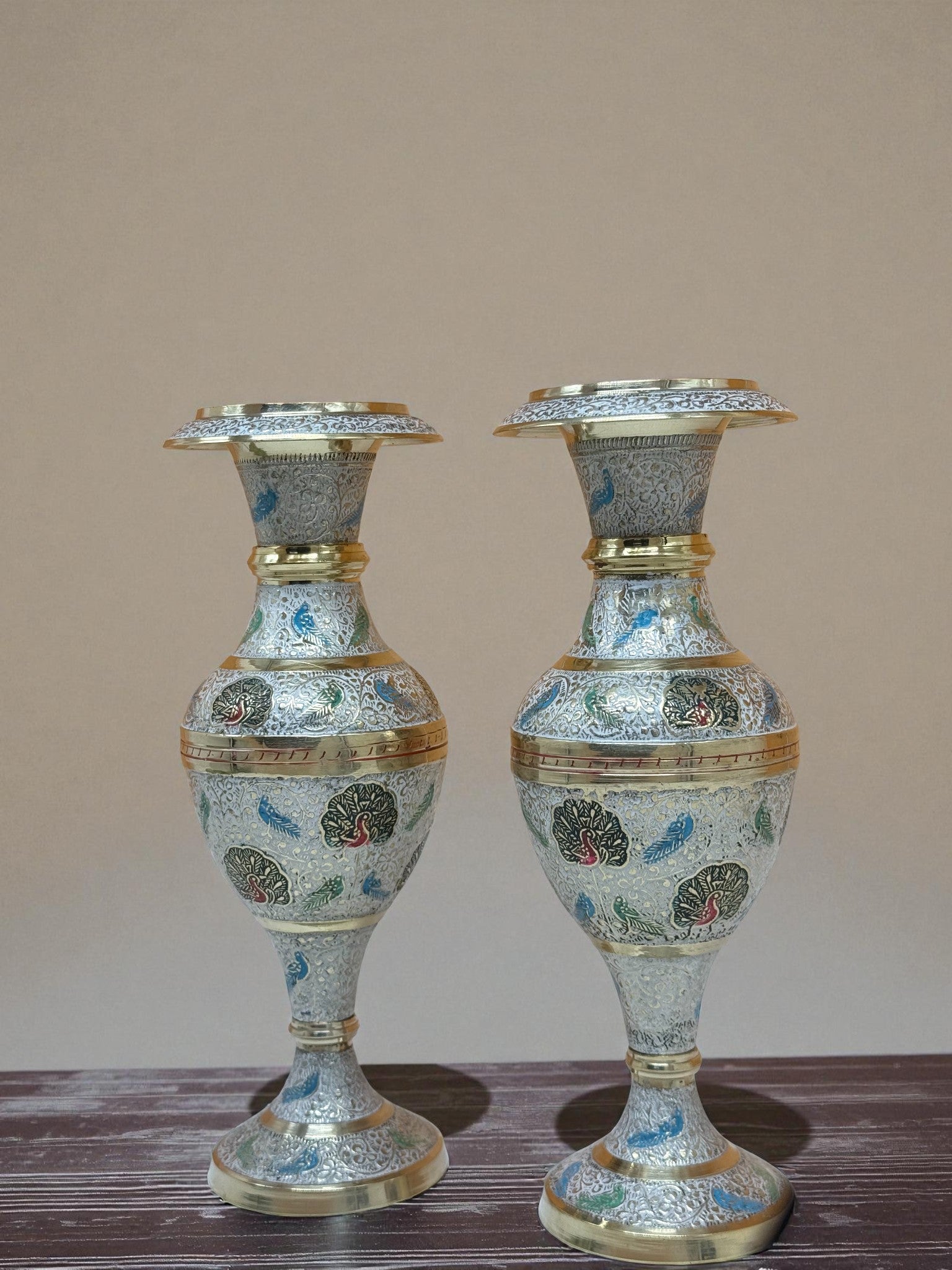 Add a touch of rich cultural artistry to your home with this exquisite set of 2 Hand-Painted Brass Vases. Crafted by skilled artisans, each vase features vibrant enamel work over a polished brass base—highlighting intricate floral and peacock motifs that make every piece truly unique.