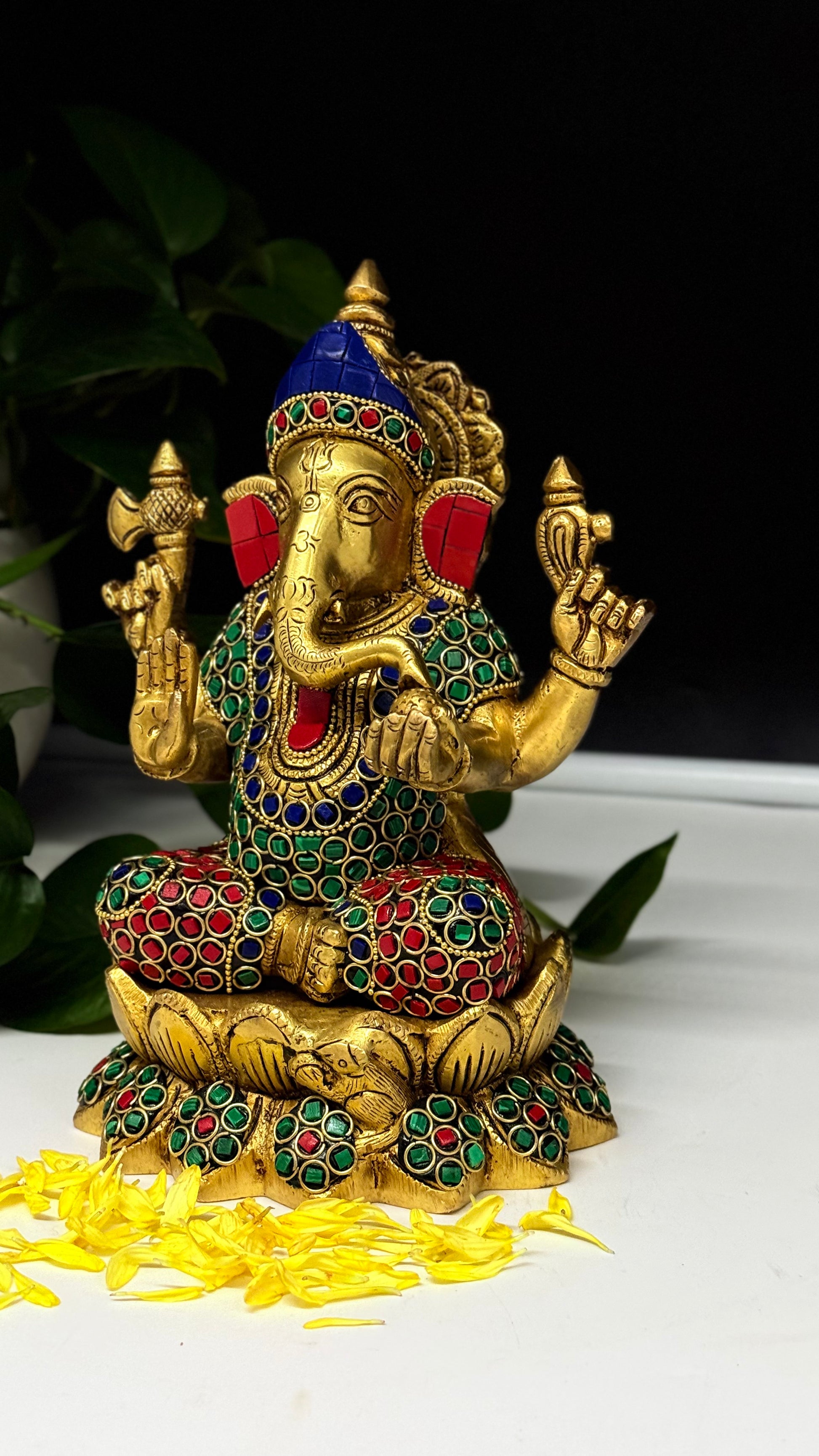 Handcrafted Brass Ganesha Murti with Vibrant Gemstone Detailing