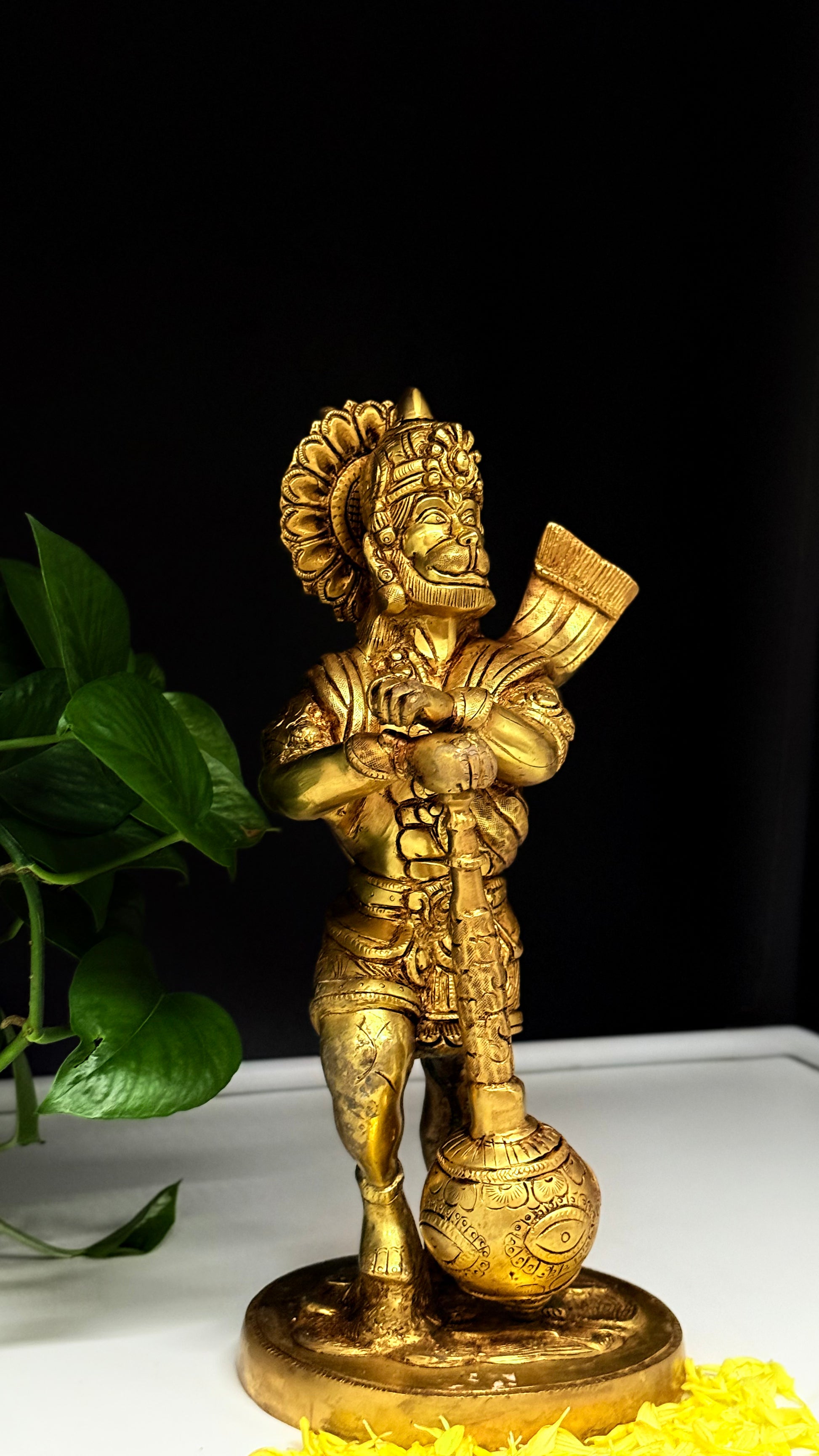 Skillfully crafted by Indian artisans, every detail reflects traditional metalwork excellence. The intricately carved crown (Mukut), detailed armor, flowing sash, and expressive facial features capture Hanuman’s fierce determination and benevolent wisdom. Mounted on a sturdy brass pedestal, this statue ensures stability while creating a grand presence in any setting. The rich antique gold finish highlights its intricate carvings and timeless elegance.