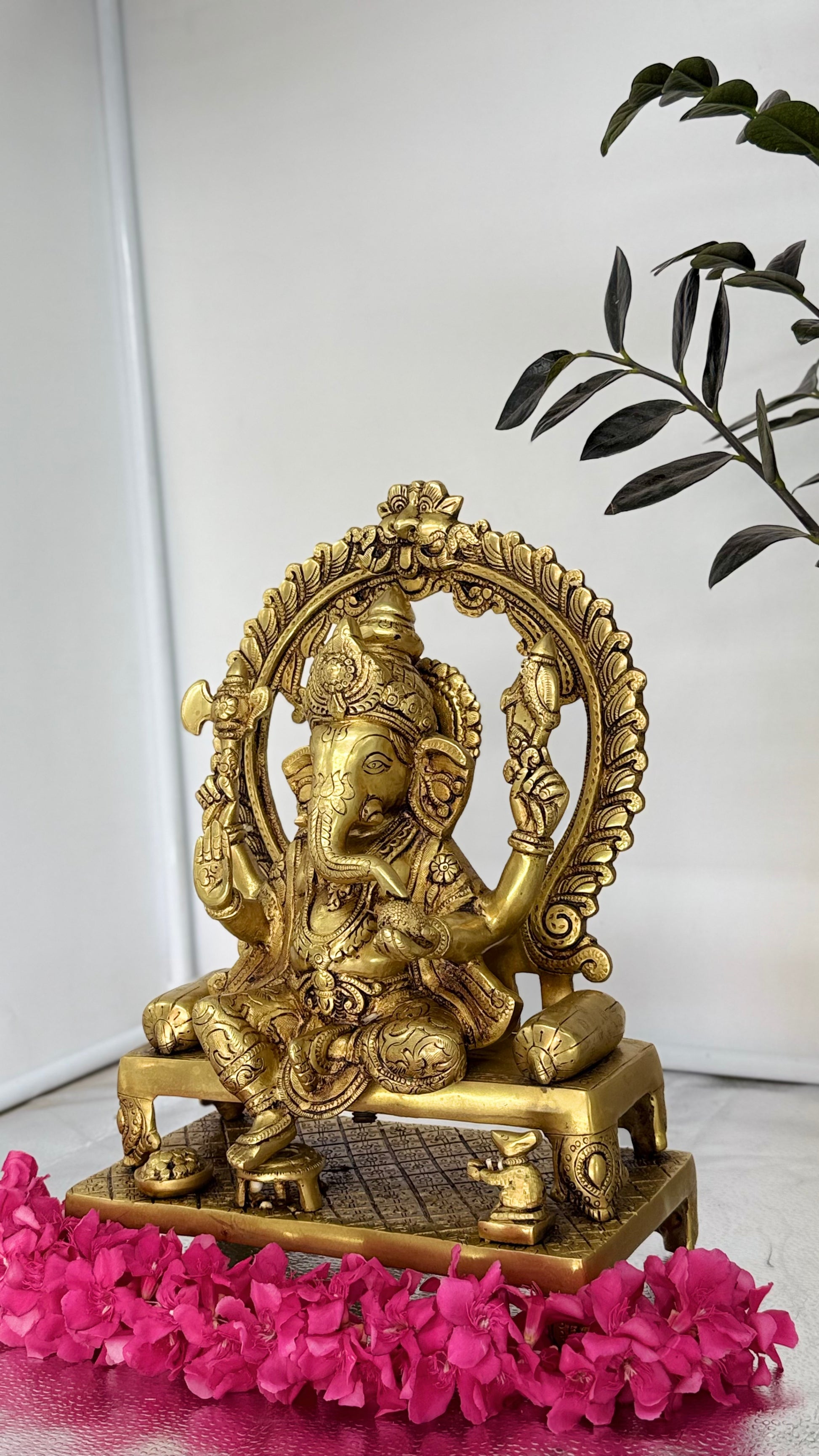 Majestic Seated Brass Ganesha with Ornate Arch – Divine Elegance for Your Home Temple & Decor