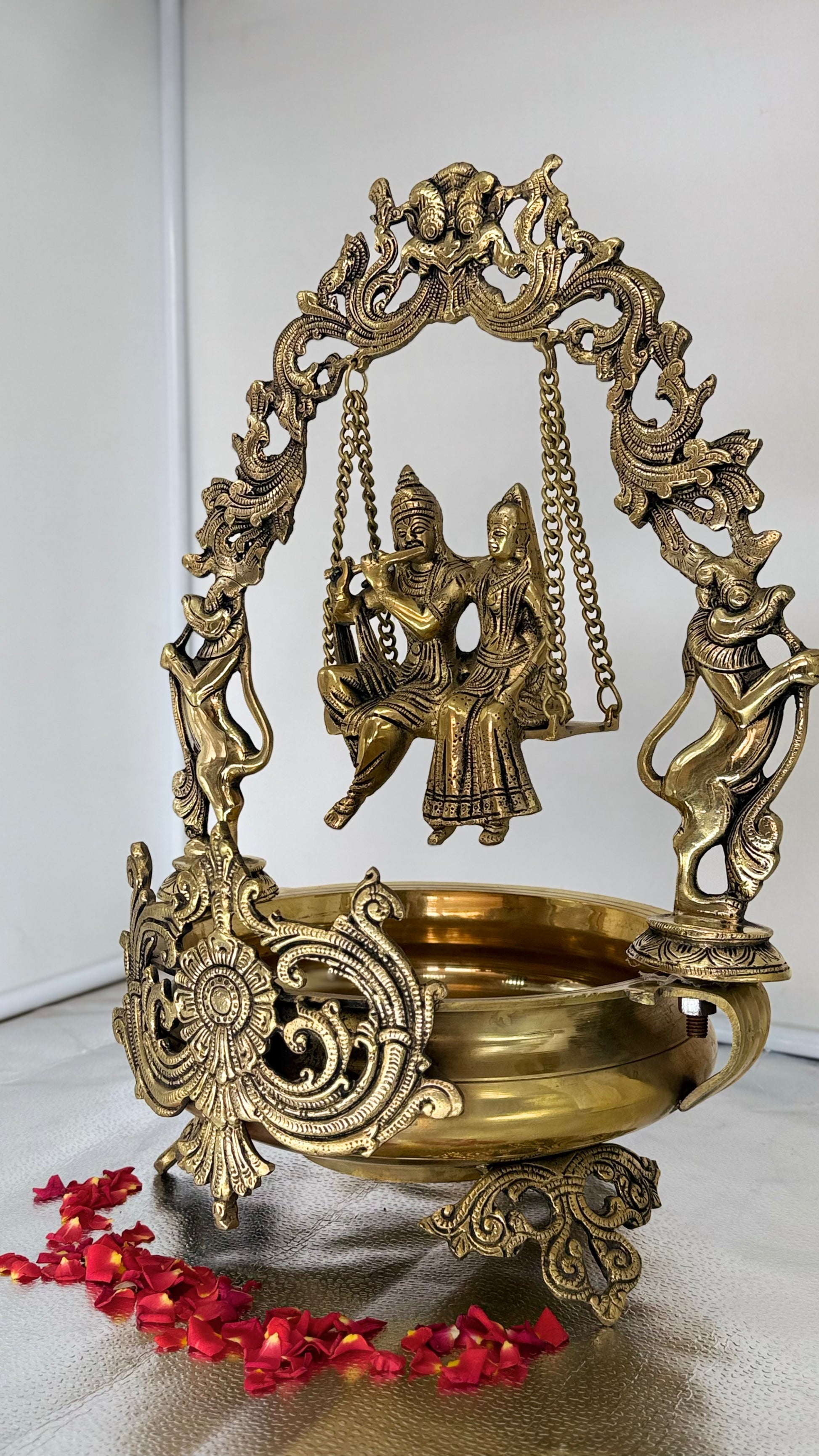 The Eternal Swing of Love - Brass Radha Krishna Jhula with Floral Bowl