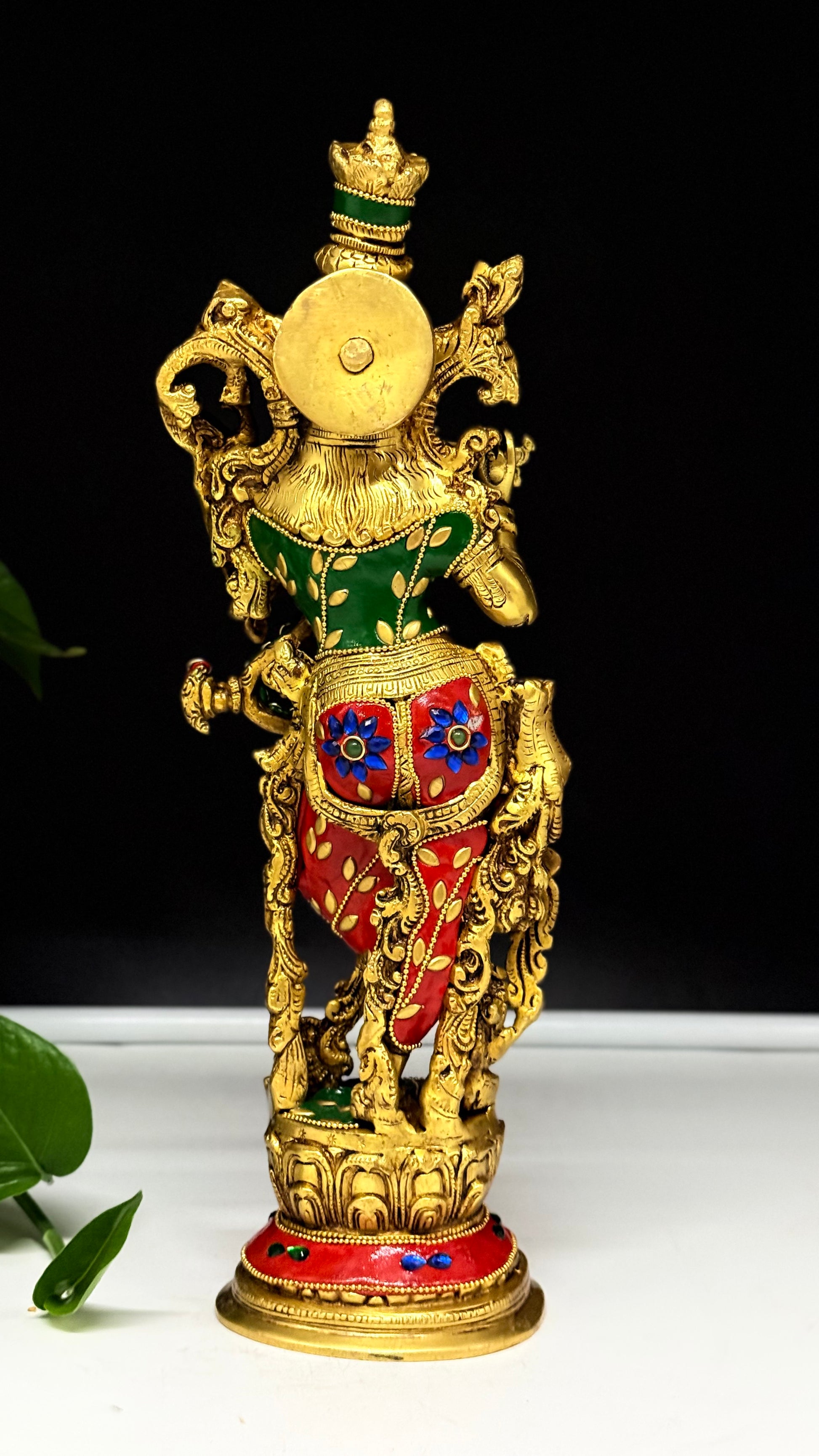 What makes this piece truly captivating is the multi-color enamel detailing paired with hand-set gemstones, creating a striking fusion of tradition and vibrant artistry. The vivid reds, blues, and greens highlight every intricate carving, from Krishna’s attire and jewelry to the beautifully adorned base.
